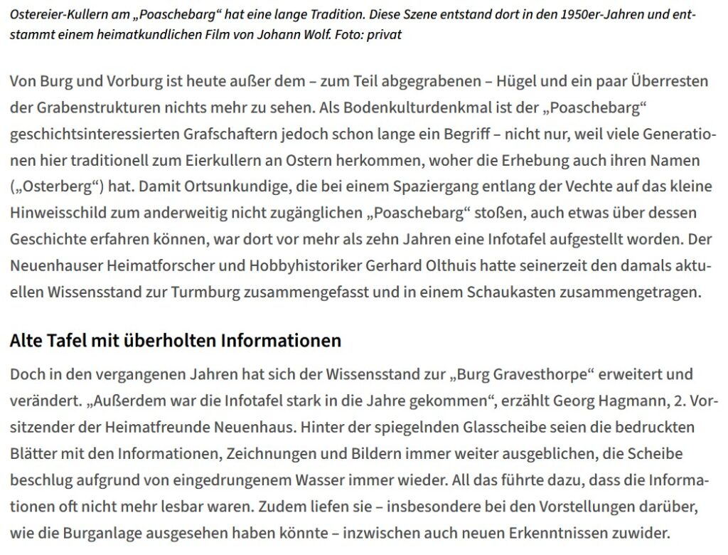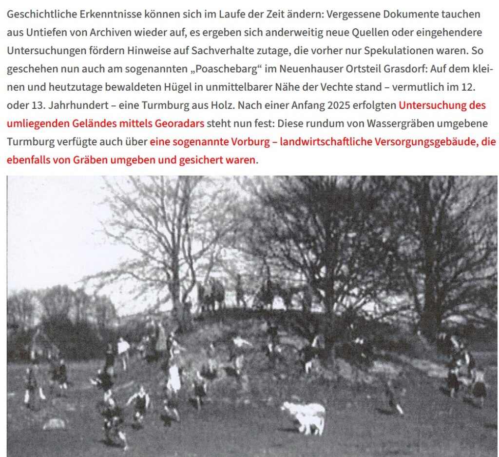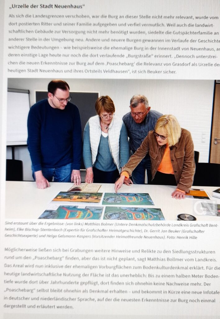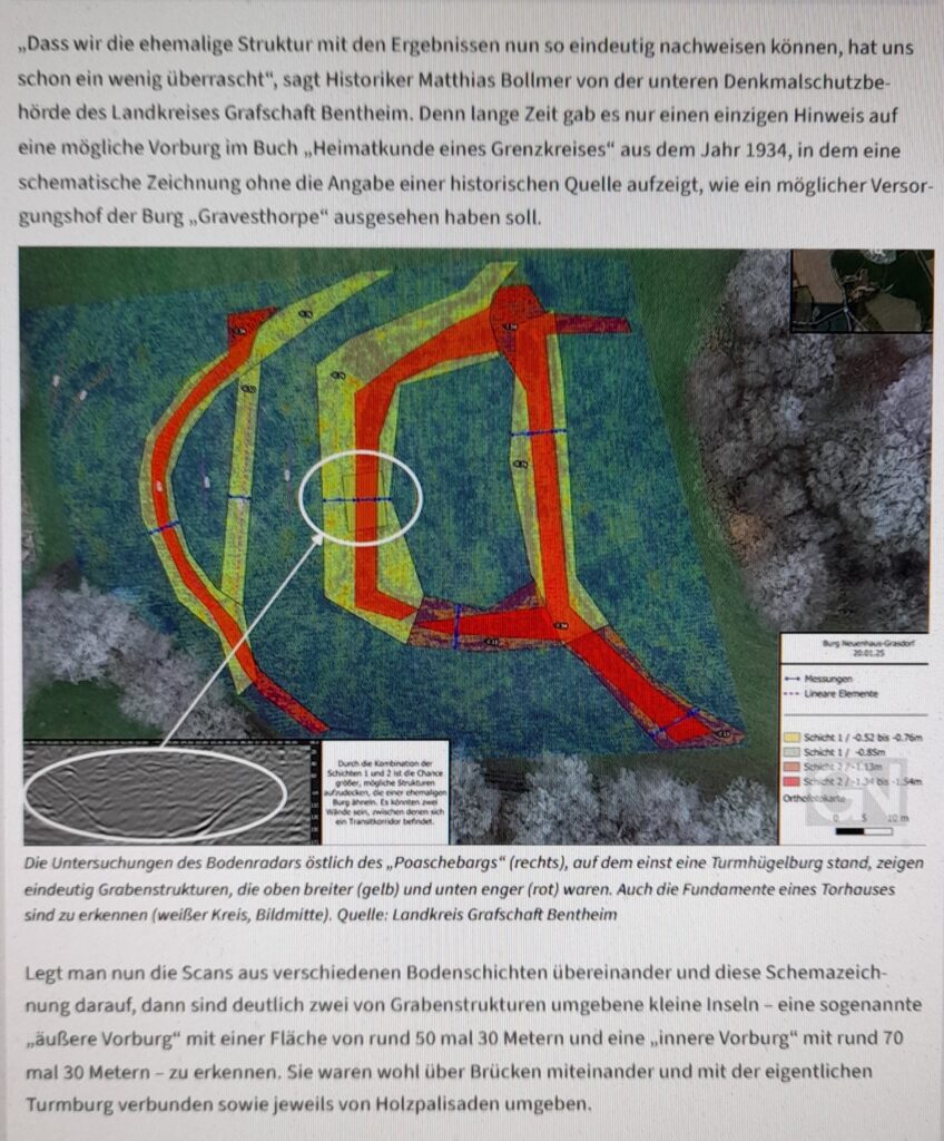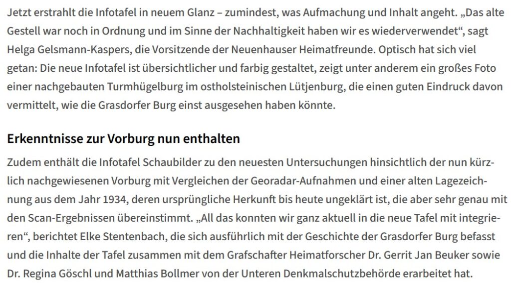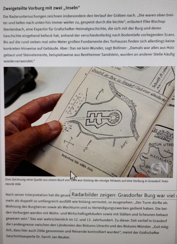 Ein Alardo de Grauesdhorp wird erstmals 1165 als Ministerial des Bischofs von Utrecht genannt. 1227 kämpfte Hendrik van Gravesdorpe an der Seite von Rudolph van Coevorden in der Schlacht von Ane (bei Gramsbergen) gegen den Bischof von Utrecht. Hendrik wurde 1230 in Hardenberg gerädert. Im Buch „Grasdorf ist überall“ (2022, 703 S., 35,-€, erhält. bei der Stadt Neuenhaus) ist die ganze Geschichte ausführlich beschrieben. Diese Turmhügelburg, die im nachfolgenden Artikel dargestellt wird, bestand etwa von 1200 bis 1600 n. Chr. Sie gehörte zum Bistum Utrecht und sicherte dessen Grenze zum Bistum Münster.